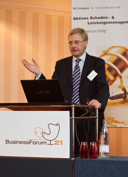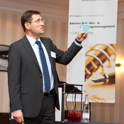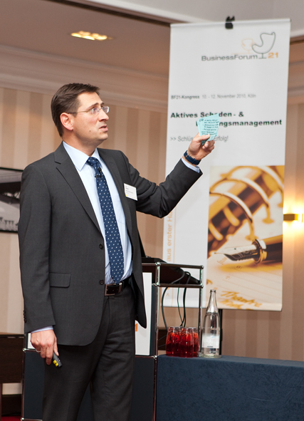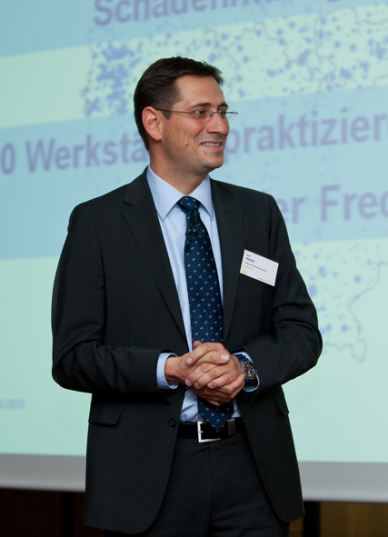 Thomas Geck, Abteilungsleiter Schaden Dezentral, HUK-COBURG sprach in seinem lebhaften Vortrag über neue Maßstäbe bei Schadenmanagement und -steuerung von Kfz-Schäden.
