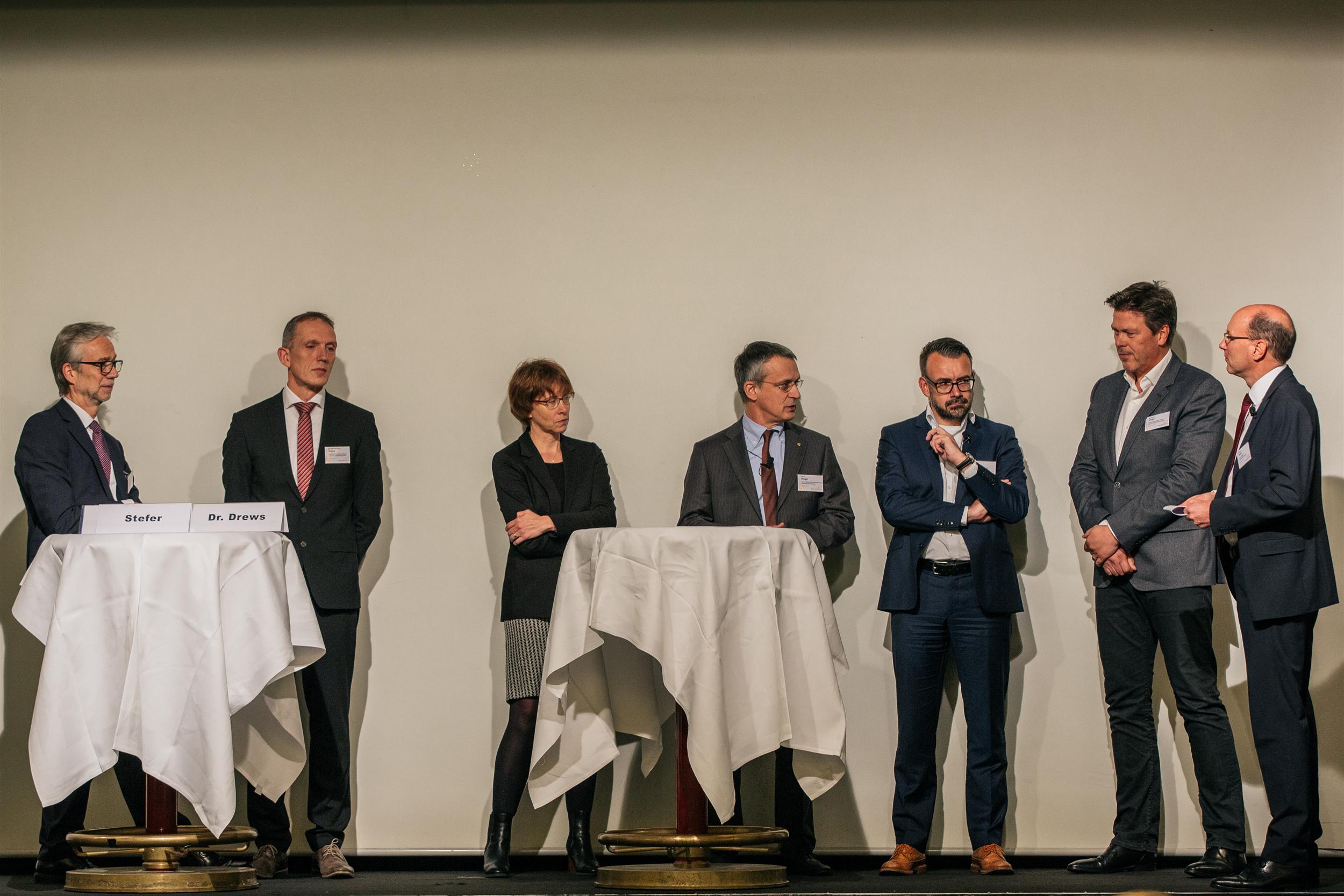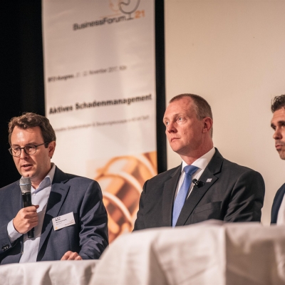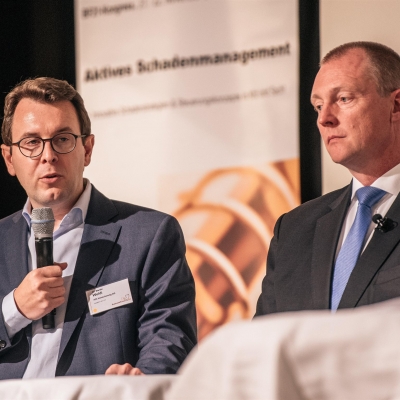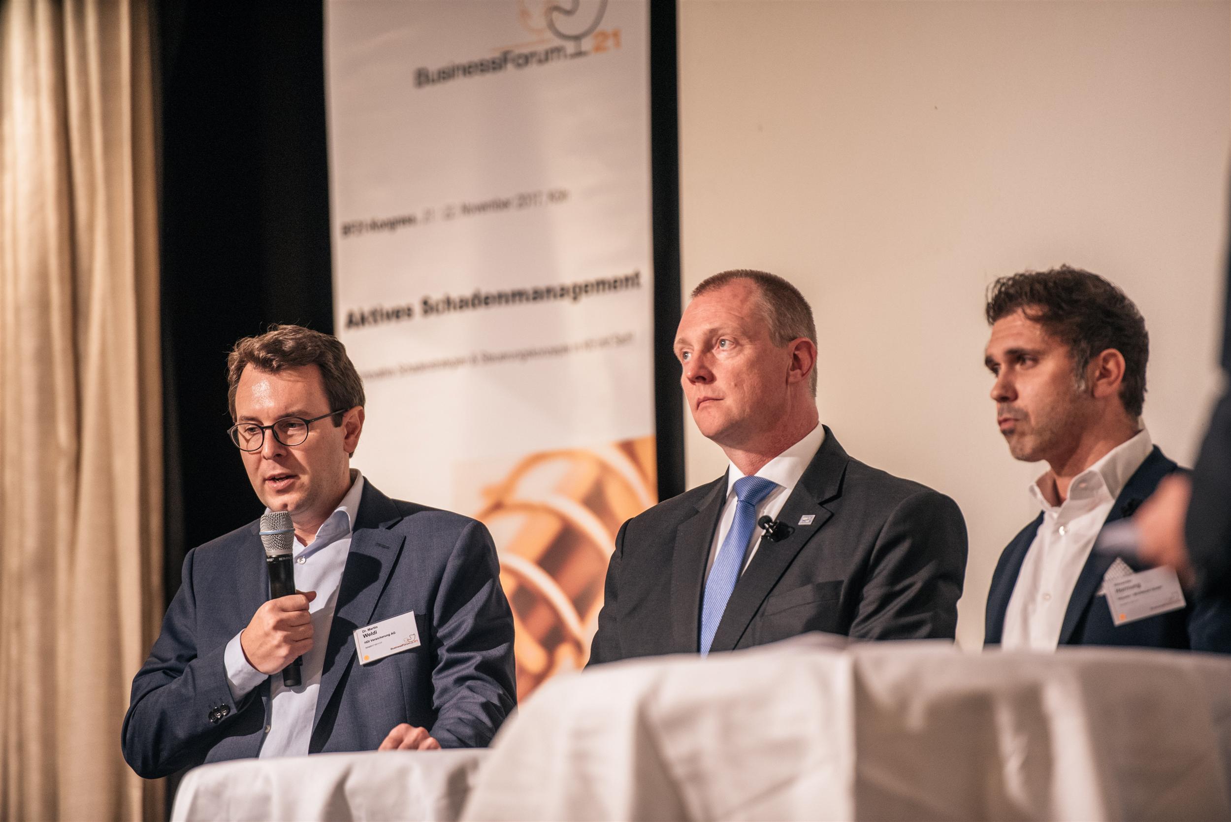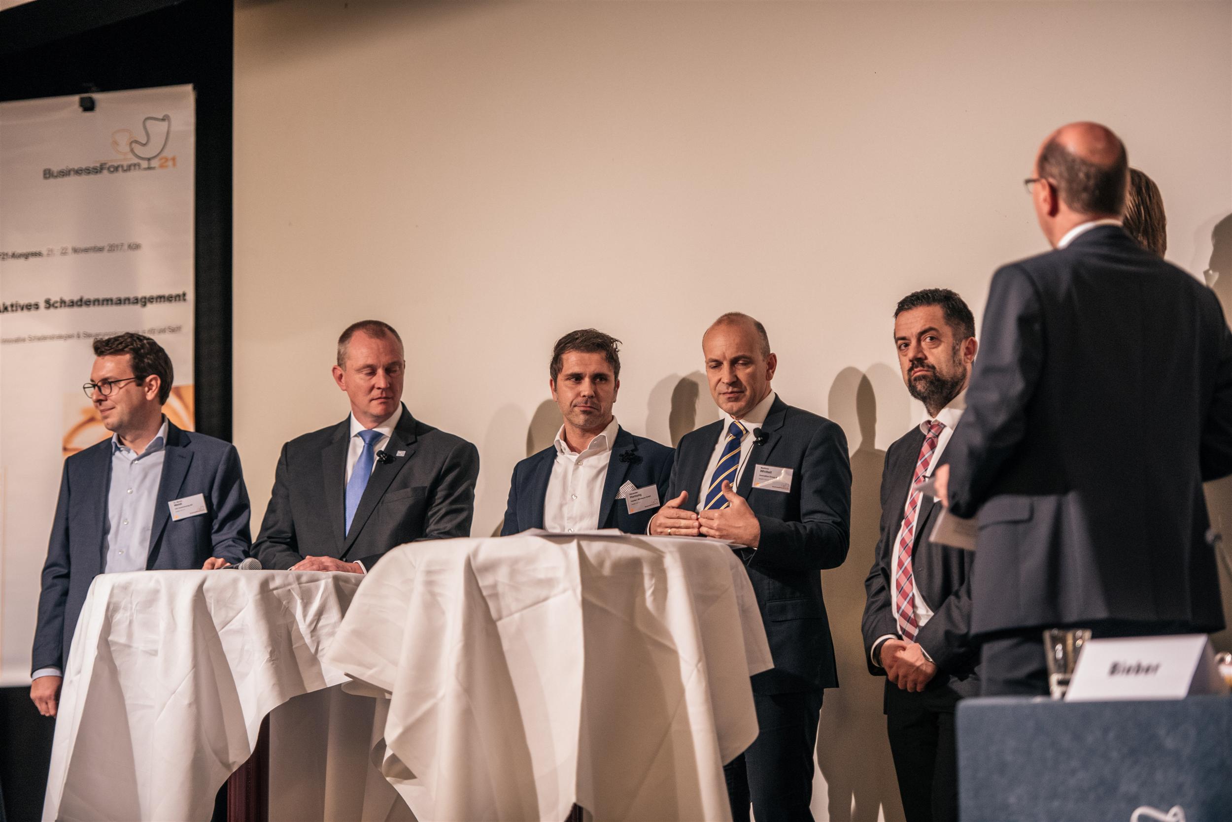 Bei der anschließenden Podiumsdiskussion stellten Silke Lautenschläger, ERGO, Ulrich Rieger, Aachen Münchener / Generali Gruppe, Rüdiger Burg, DEVK, Andreas Vietor, Westfälische Provinzial, Michael F. Stefer, Versicherungsbüro Stefer, Dr. Hermann Drews, IFS e. V. und Thomas Bieber, Thomas Bieber Management Consulting weitere Thesen zu dem Thema Innovationsfähigkeit, Digitalisierung, Kundenzentrierung im Schadenbereich auf.