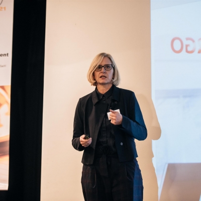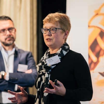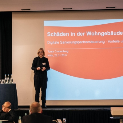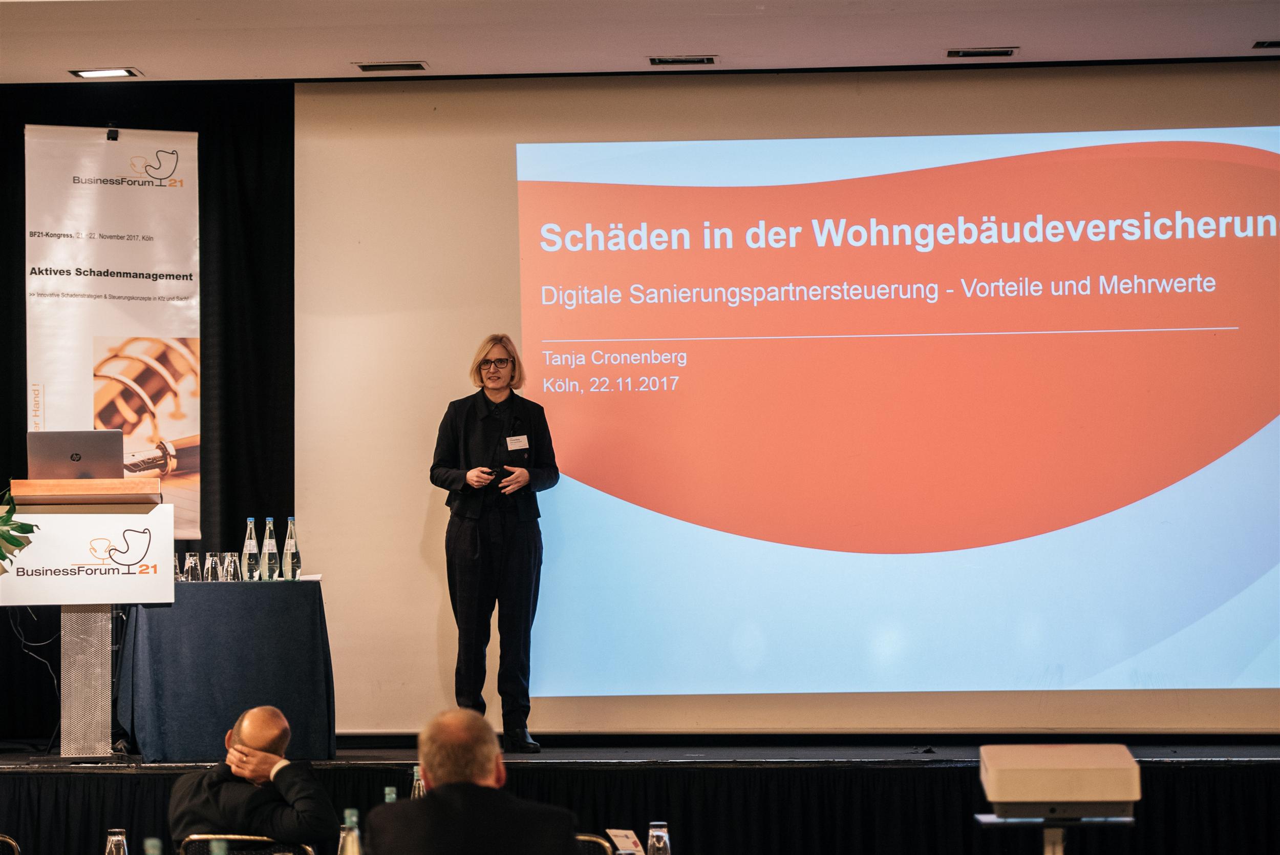 Tanja Cronenberg, Leitung Operatives Schadenmanagement, ERGO Deutschland AG referierte über das Thema „Schäden in der Wohngebäudeversicherung - Digitale Sanierungspartnersteuerung, Vorteile und Mehrwerte".